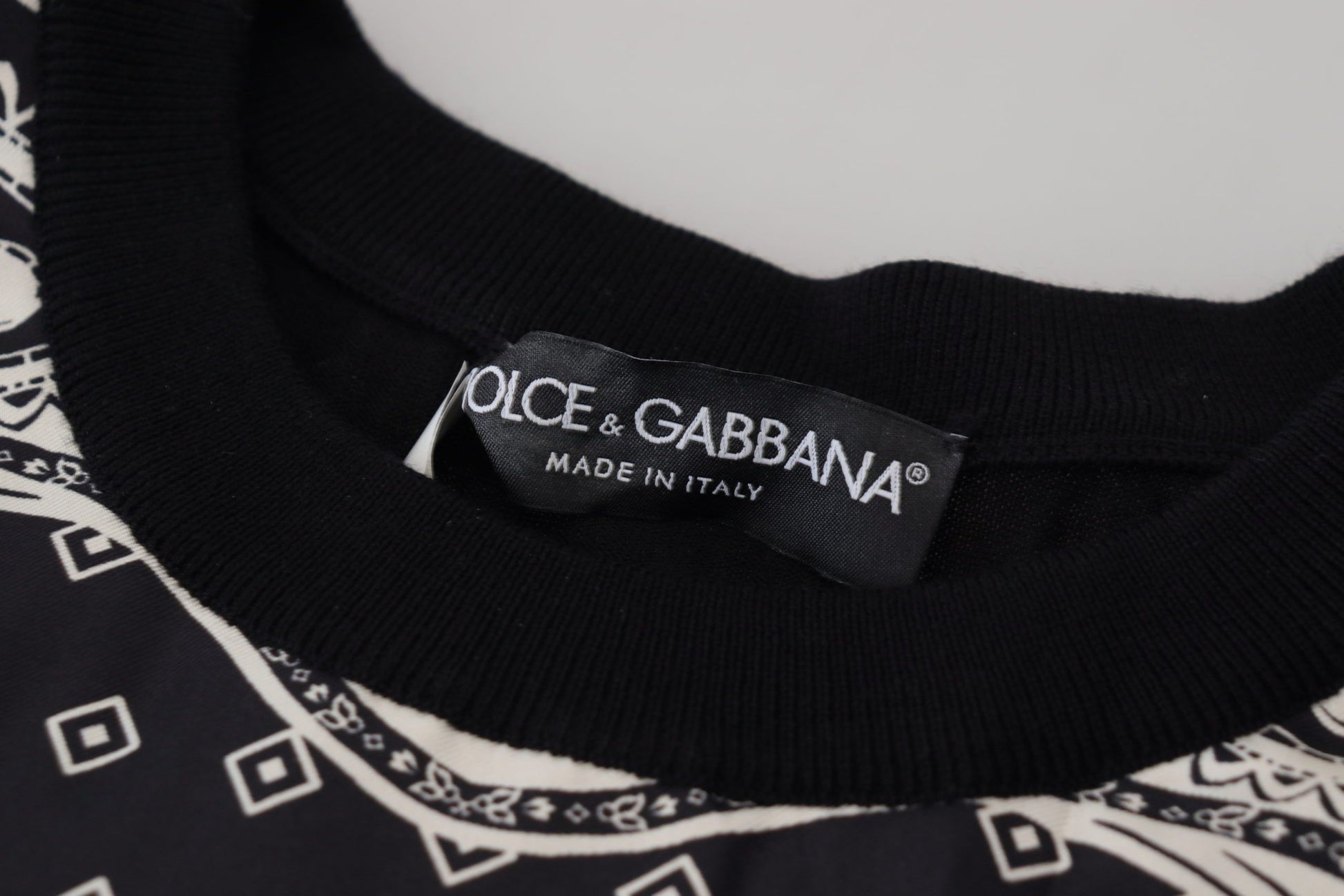 Discover the epitome of luxury knitwear with this sophisticated crewneck sweater by Dolce & Gabbana, a true statement piece for those with discerning taste. Immaculately crafted with a blend of Virgin Wool and Silk, it showcases an eye-catching bandana print that adds a touch of edge to the classic black hue. Perfect for adding a dash of Italian elegance to your wardrobe.