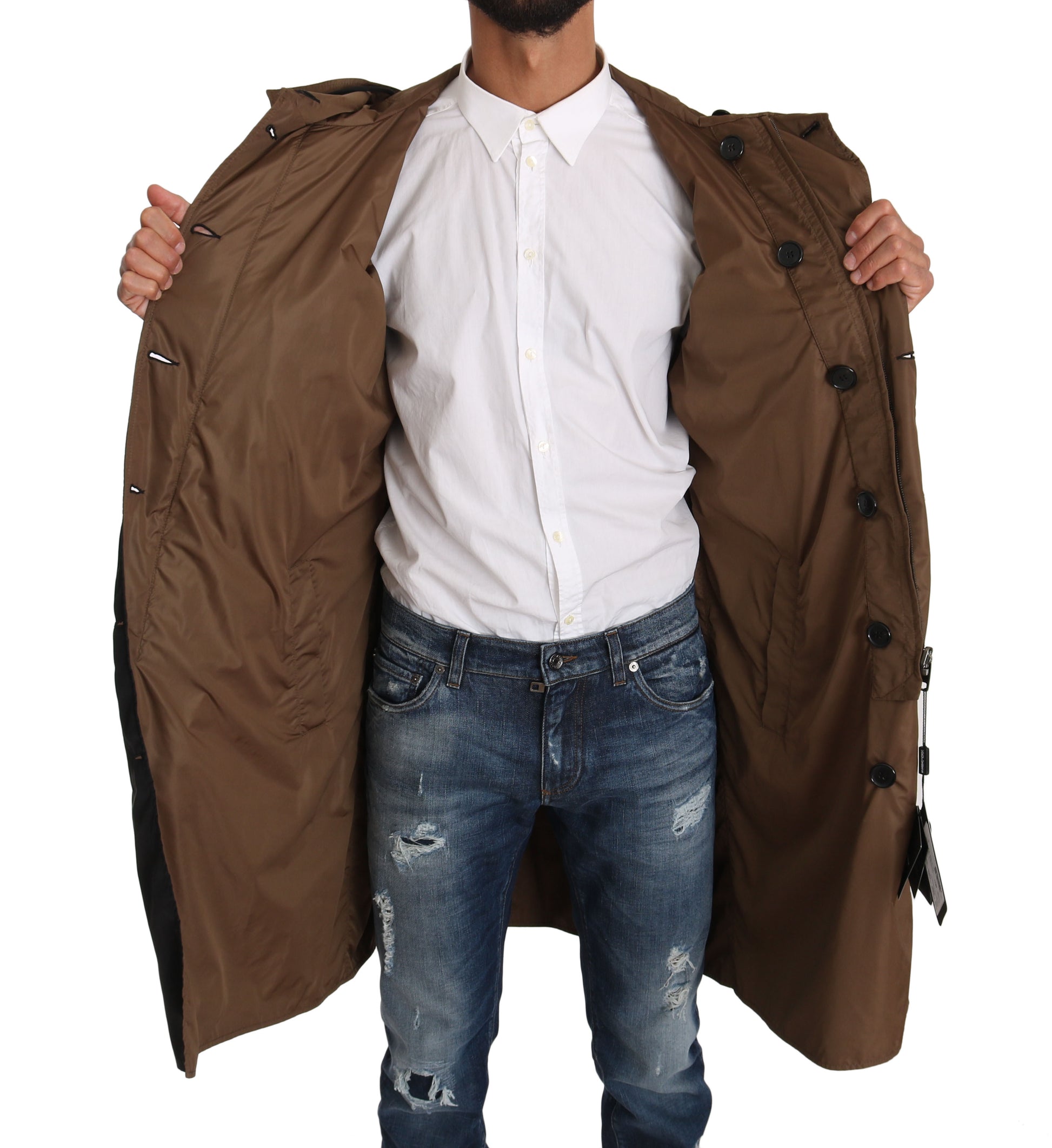 Discover the essence of style meets functionality with our Dolce & Gabbana Reversible Hooded Raincoat. Perfect for the modern man who doesn’t let the elements dictate his day. This luxurious coat is a fantastic addition to your wardrobe with its elegant black and brown reversible design, ensuring versatility and style for any occasion.