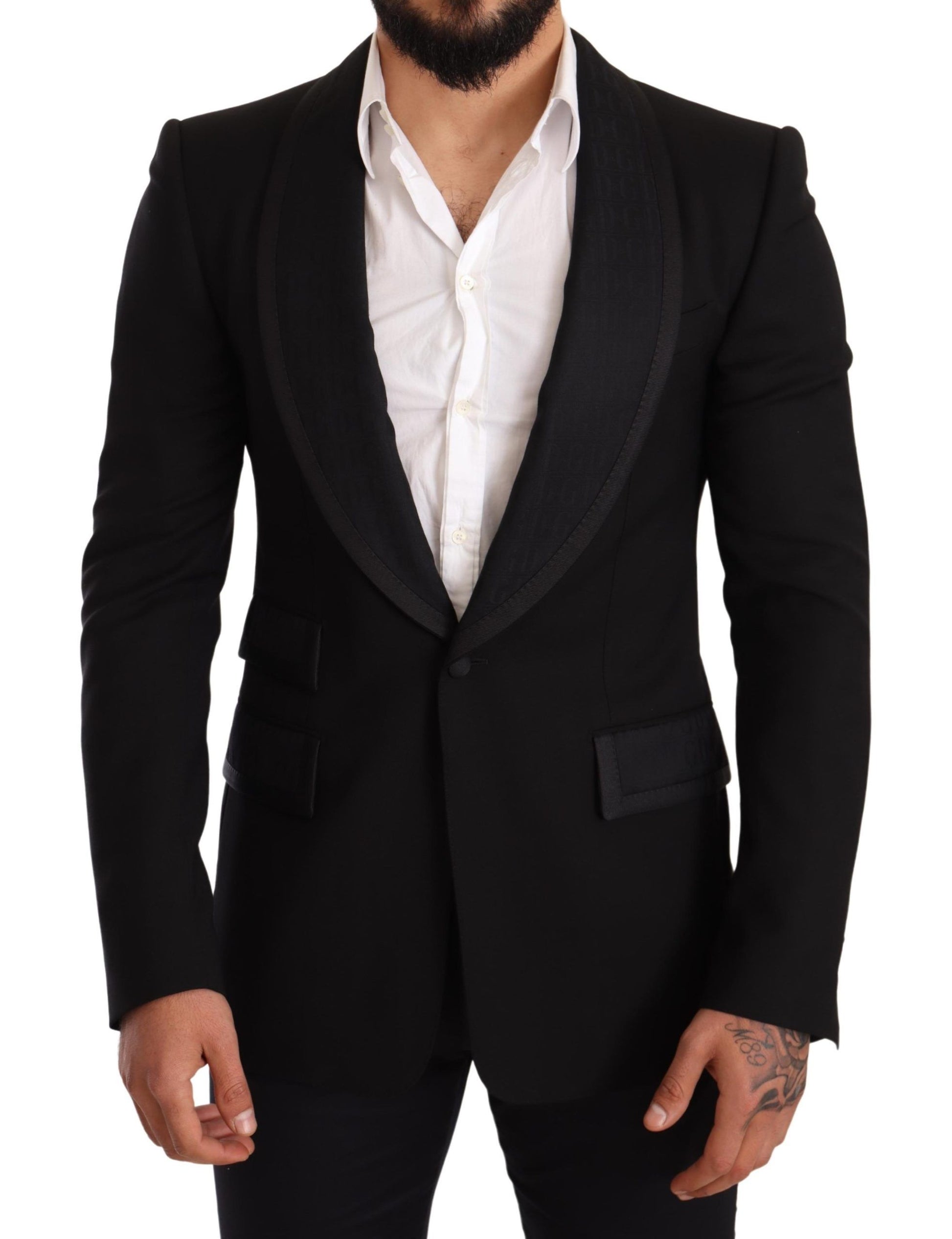 Embark on a journey of style with the Dolce & Gabbana formal blazer, a testament to luxurious tailoring and exquisite design. With its sharp shawl lapel style, this blazer encapsulates the epitome of sartorial perfection. The single-breasted one-button closure ensures a sleek silhouette, complementing the slim-fit cut that caters to the modern gentleman. Its lavish black hue promises to deliver a statement of sophistication at any upscale event.