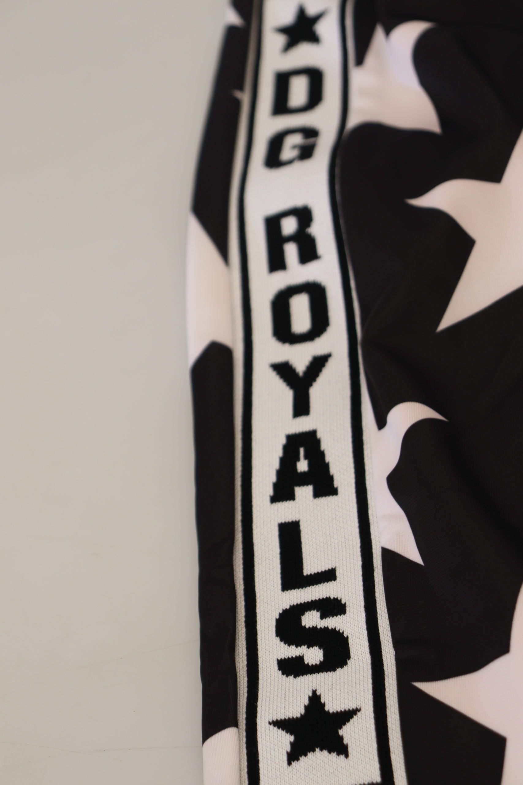 Step into comfort and luxury with these exquisite casual sport gym sweatpants from Dolce & Gabbana. Perfect for both leisure and athletic endeavors, these pants are a blend of coziness and high-end fashion. They feature a dazzling black with white stars print and ‘DG Royals’ that effortlessly elevate your casual wardrobe. Expertly crafted in Italy, these sweatpants offer a regular fit and are finished with thoughtful details such as a stretch waist band and a secure pull string closure for the perfect fit. The zippered pockets are both stylish and functional, keeping your essentials safe. With the renowned logo proudly on display, these pants are a testament to Dolce & Gabbana’s attention to detail and commitment to luxury.