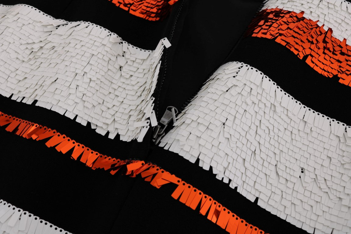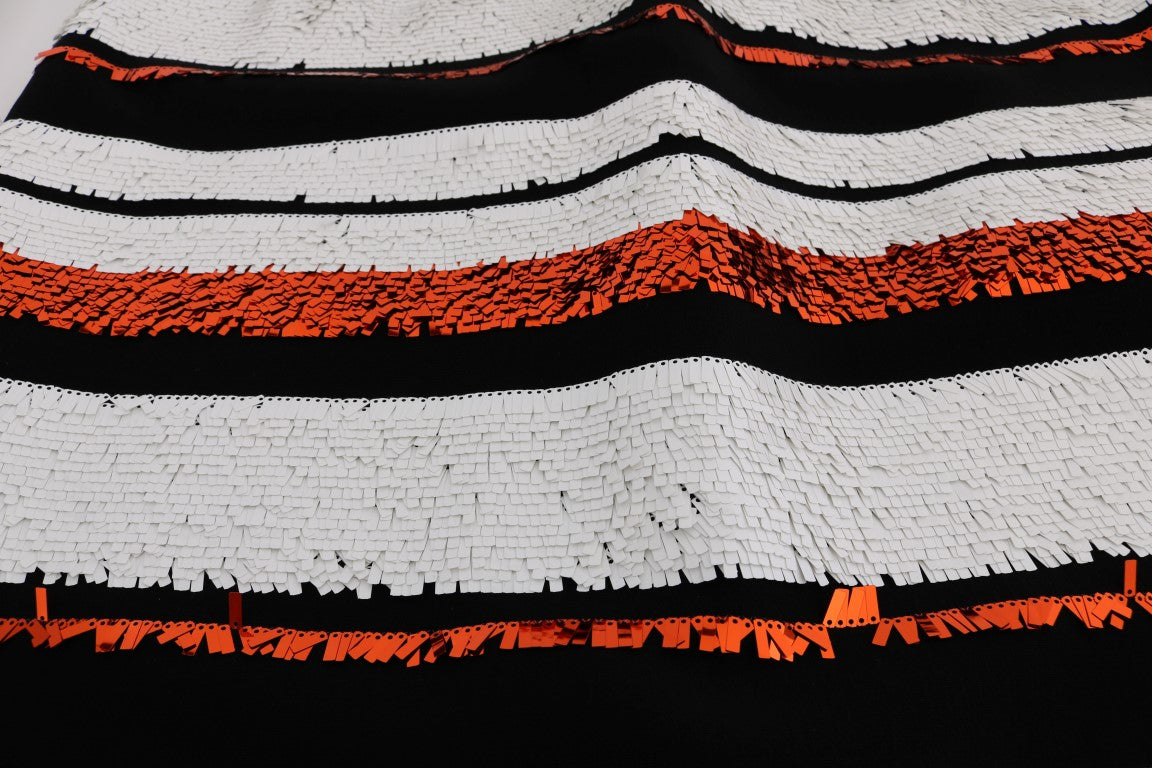 Step into the world of high fashion with this stunning Dolce & Gabbana sleeveless sheath dress. Crafted with impeccable Italian craftsmanship, this piece flaunts bold stripes in white, orange, and black, ensuring you make a memorable statement at any high-profile event. It’s a luxurious blend of wool and elastane providing comfort with a hint of stretch, coupled with a sleek zipper back for a perfect fit. This dress isn’t just a garment—it’s a testament to luxury and exclusivity.