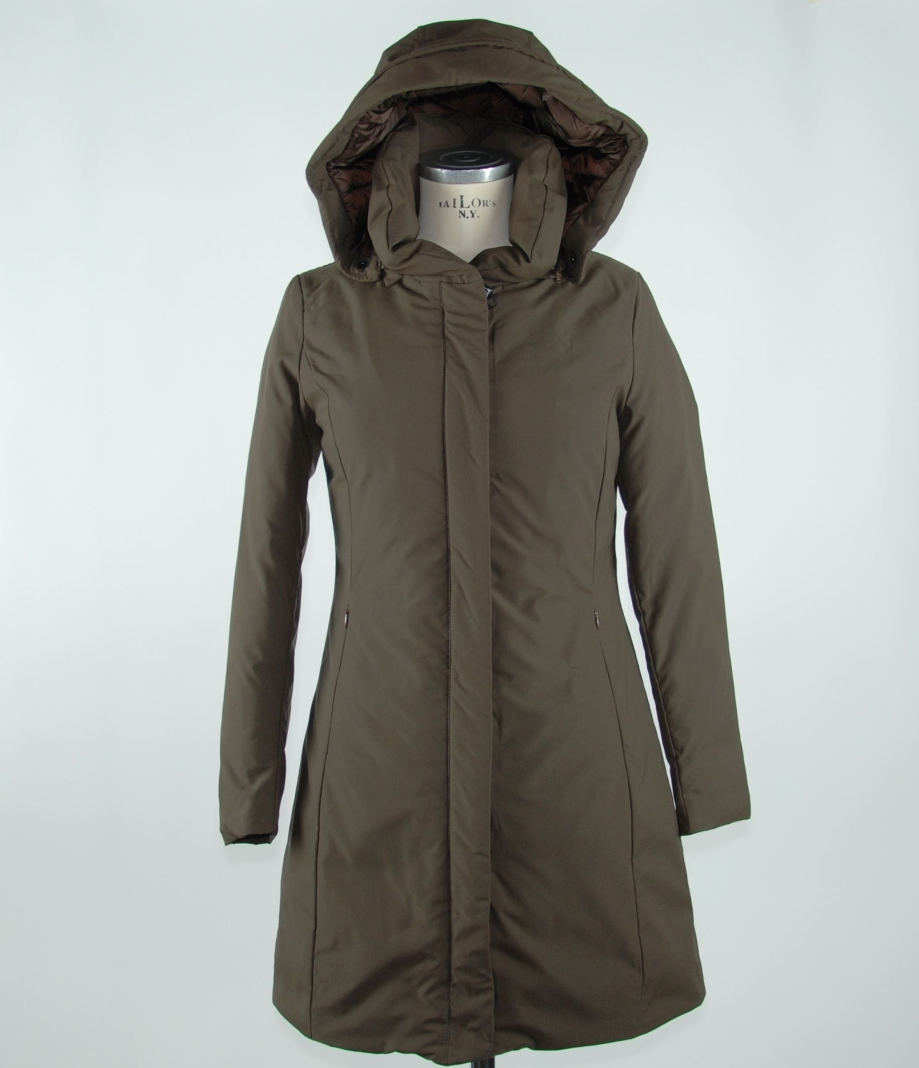 Discover the essence of practical elegance with the Emilio Romanelli Brown Polygon Jacket. Designed for the modern woman, this sophisticated piece comes equipped with a convenient removable hood, making it ideal for varying weather conditions. The zip closure ensures a snug and stylish fit, perfect for day-to-night transitions.