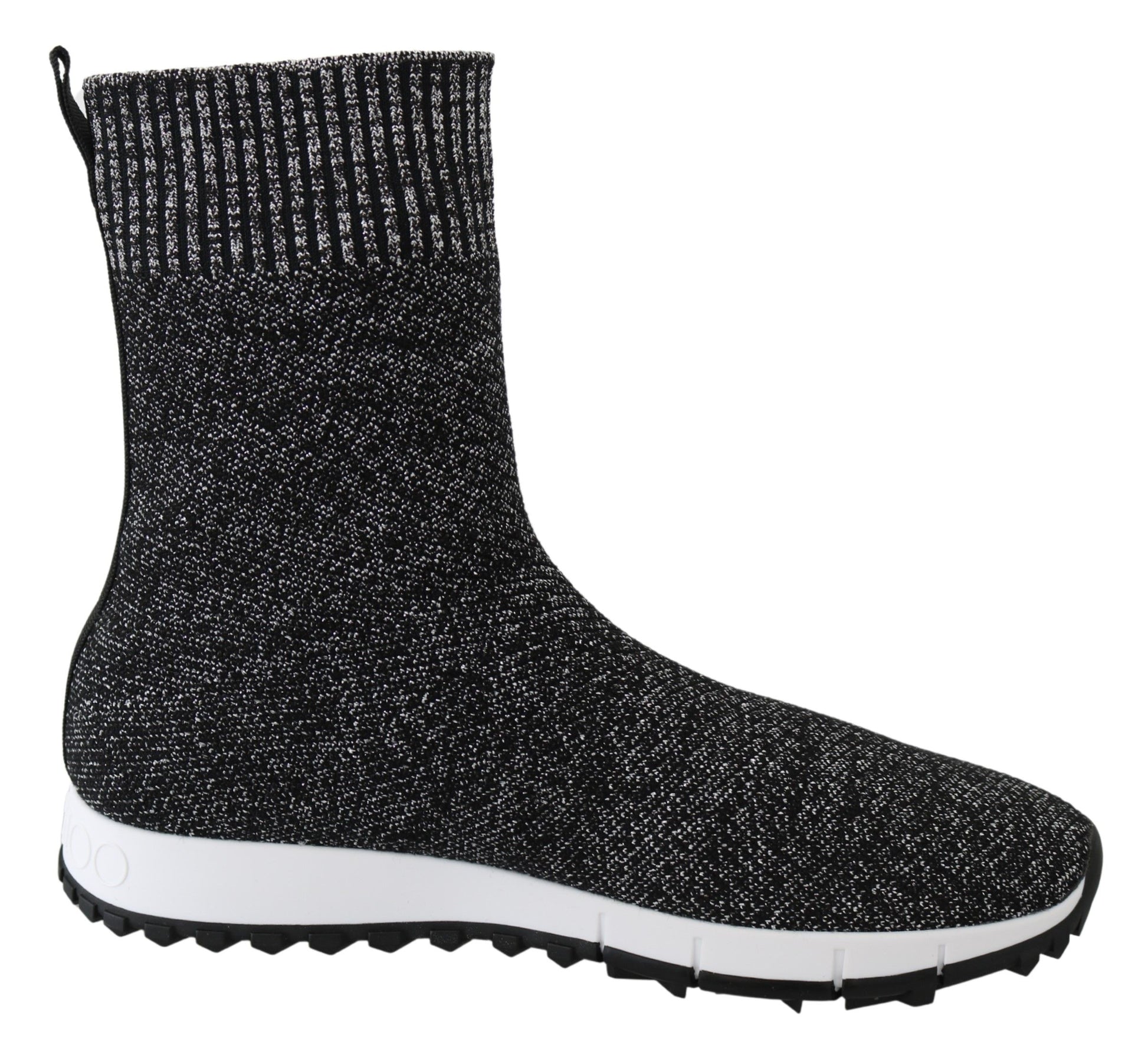 With their eye-catching black and silver color scheme, these shoes are not just a statement piece but also a testament to the opulence that Jimmy Choo is renowned for. Crafted from a premium knitted lurex mix, they offer both comfort and sparkle with every stride.