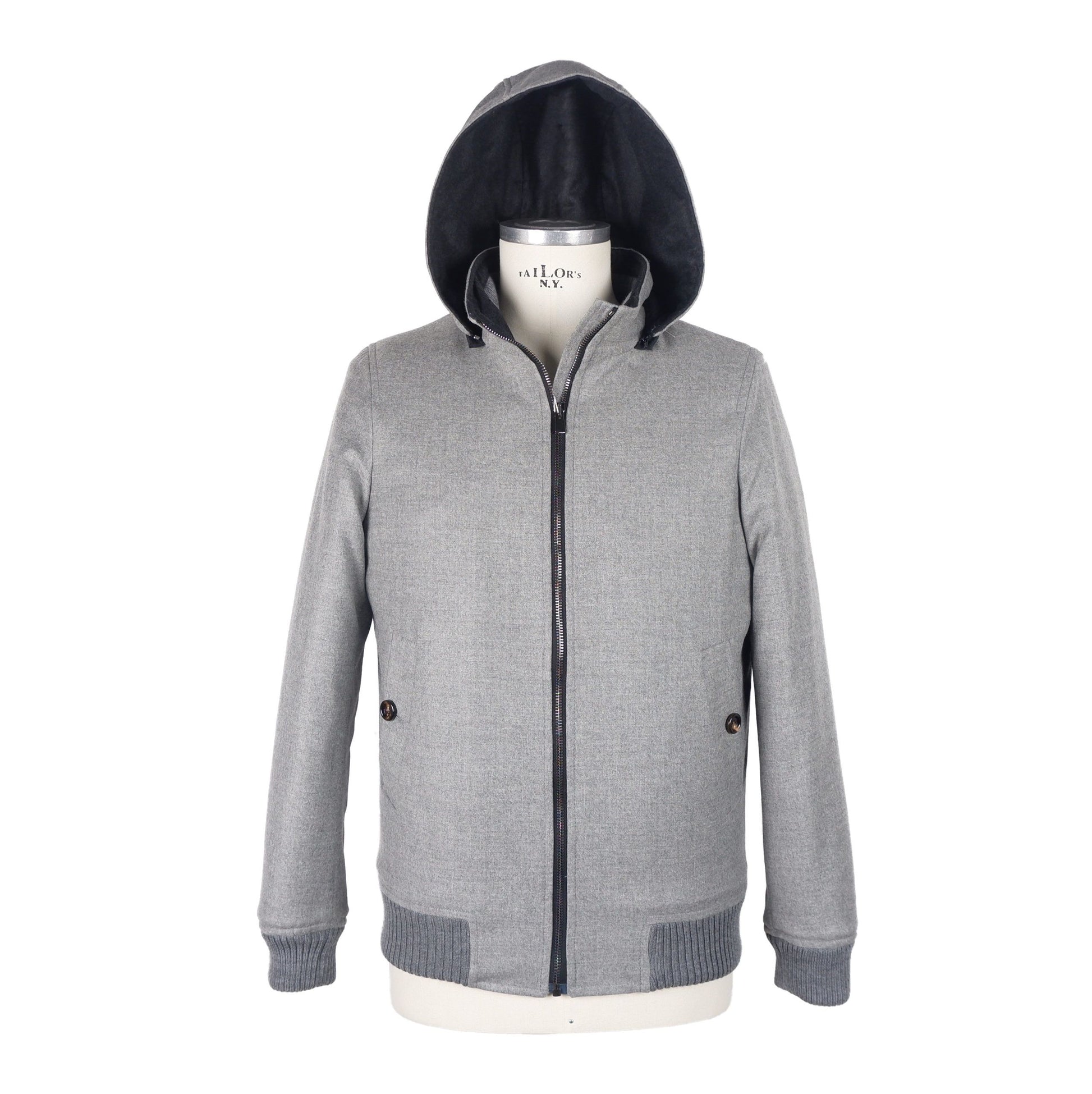 Experience timeless elegance and exceptional quality with this luxurious men’s jacket from the bespoke ‘Made in Italy’ collection. Crafted from a premium blend of 95% wool and 5% cashmere, this jacket promises warmth and style with its removable hood and sophisticated design. Perfect for elevating any ensemble, it features a smooth zip closure, two front pockets with secure button closure, and additional two internal pockets for functionality. The gray hue adds to its versatility, making it an essential piece for the sartorial gentleman.